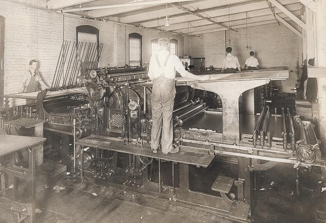 Source: http://www.CalendarCompany.com, employees run the printing press at Calendar Company in Greeneville, Tennessee (photo undated). Founded in 1876, Calendar Company is known for the original Ramon’s Brownie almanac. The business is still in operation today.