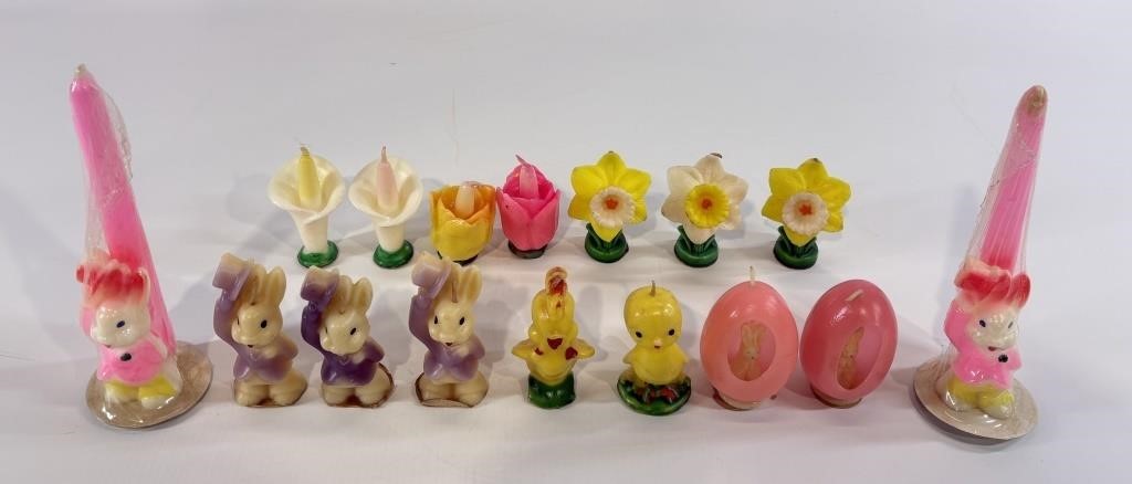 Lot #460 in this weekend’s sale by Gehman Auctions (Ephrata, PA) is a sweet collection of vintage Easter and spring candles by Gurley.