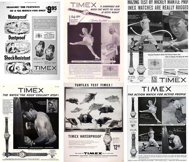 Source: http://www.TXAntiqueMall.com, collage of vintage Timex watch advertisements.