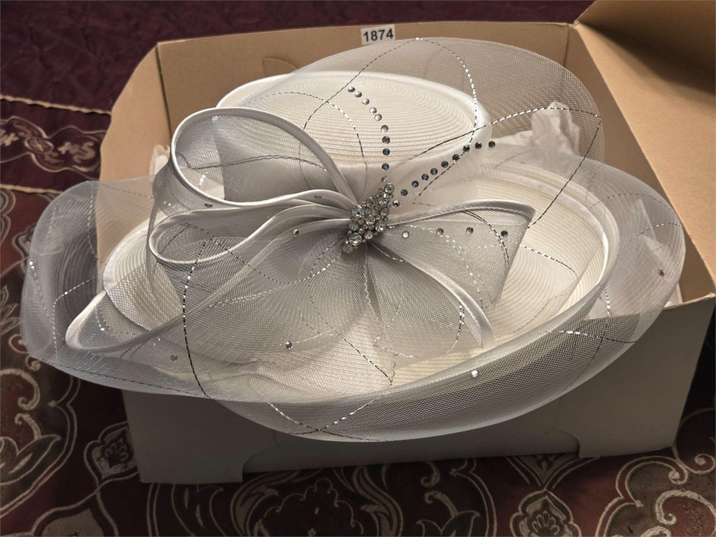 When I checked HiBid for upcoming auctions of Kentucky Derby hats, only one listing popped up. Kudos to Taylor Auction in West City, IL, for using “Kentucky Derby hat” in their description of this elegant white-and-silver head topper.