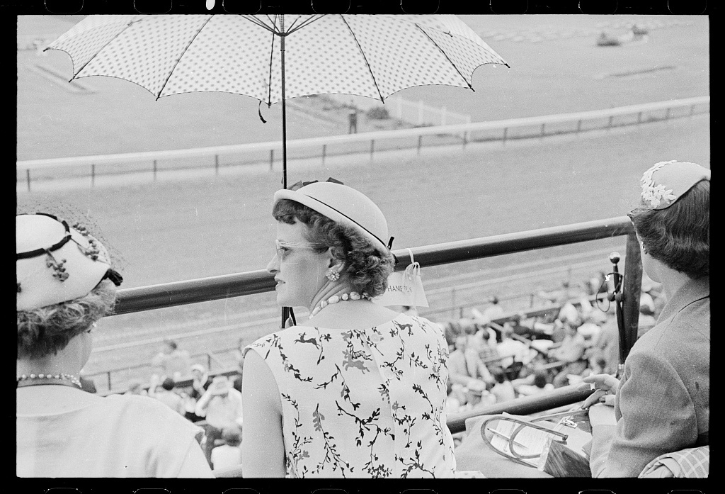 Source: Library of Congress, “….back view of well-dressed women wearing hats, one holding an umbrella, seated in bleachers at Kentucky Derby race course.” Photo by Toni Frissell, May 1954.