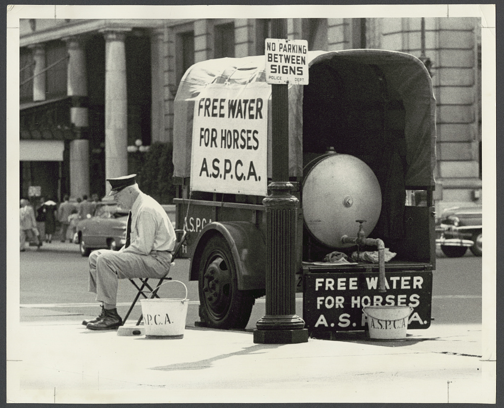 Source: Library of Congress, “Photograph shows man sitting on chair in front of a covered trailer with water tank in back to provide horses with free water by the American Society for the Prevention of Cruelty to Animals.” Photo by Angelo Rizzuto, July 1952.