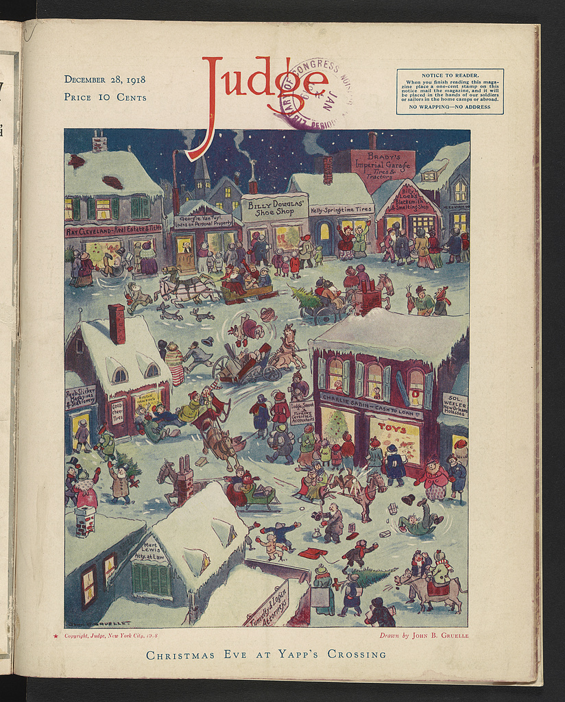 Source: Library of Congress, “Christmas Eve at Yapp’s Crossing” illustration by John Barton Gruelle, published in 1918 by Leslie-Judge Company, New York City. Gruelle is best-known as the creator of Raggedy Ann and Andy.